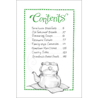 Chapters include Farmhouse Breakfasts, Old-Fashioned Breads, Simmering Soups, Patchwork Salads, Family-Style Casseroles, Hometown Main Dishes, Country Sides, Grandma’s Baked Goods