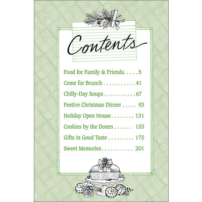 - Chapters include Food for Family & Friends, Come for Brunch, Chilly-Day Soups, Festive Christmas Dinner, Holiday Open House, Cookies by the Dozen, Gifts in Good Taste, Sweet Memories